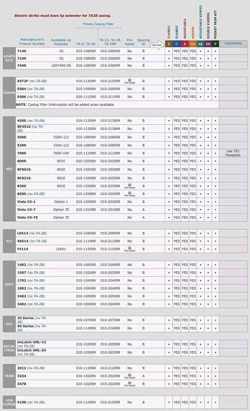 | 1 3/8″ DOOR | T-Strike (adjustable) Timely | TA-1 | • | A | YES | YES | • | • | • | • | • | • | S-50 | • |